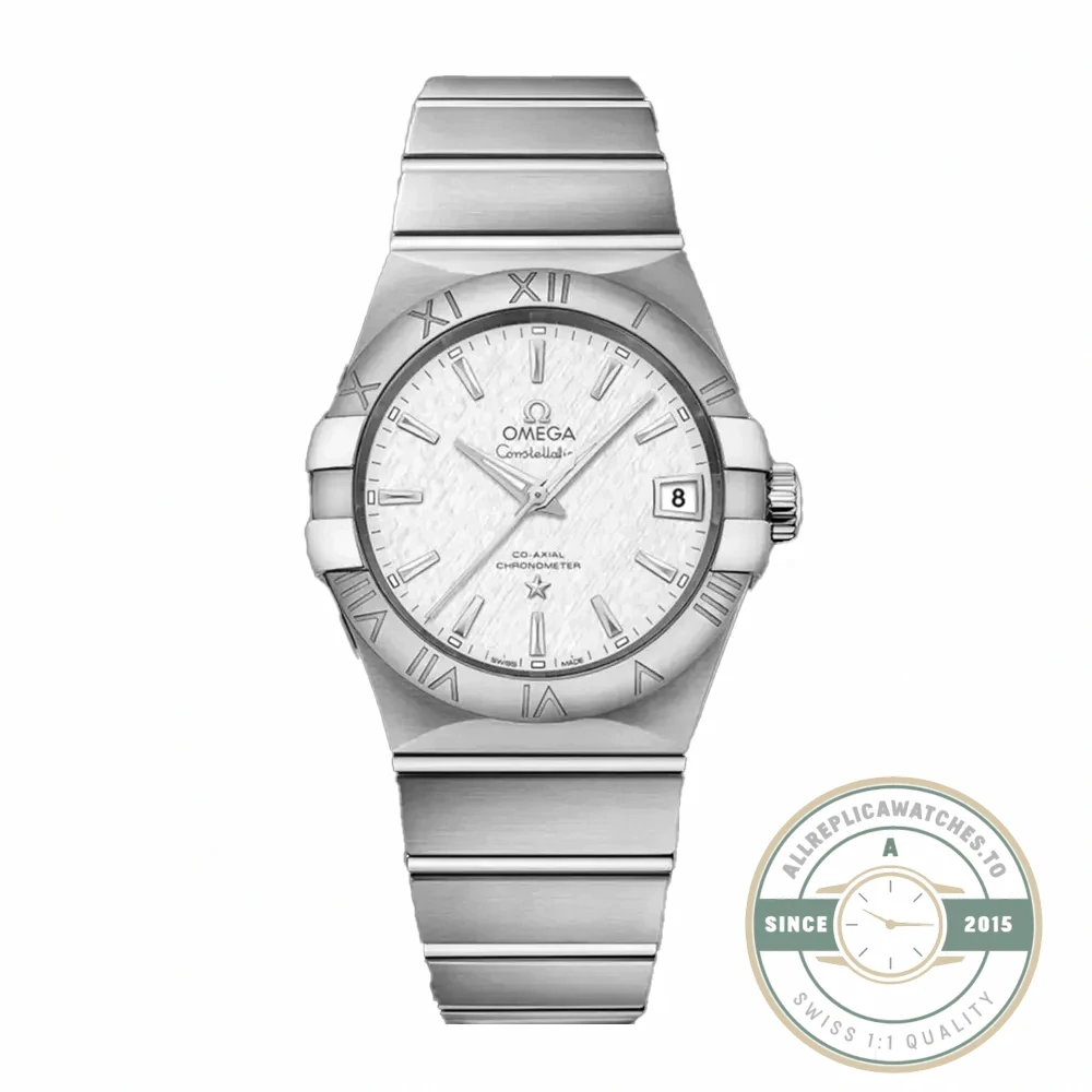 The Omega Constellation ref. 123.10.38.21.02.004 features a 38mm stainless steel case. This model is part of our Constellation collection. 38mm stainless steel case. Co-Axial Master Chronometer, date display, sapphire crystal. Steel bracelet with folding clasp.