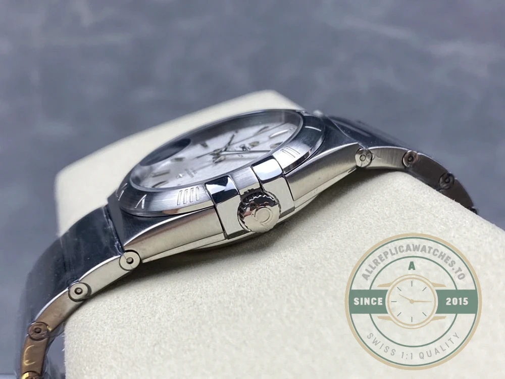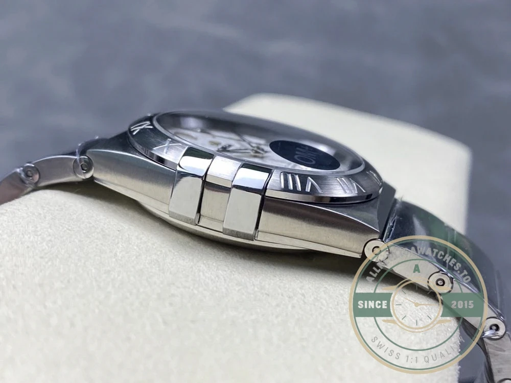 Attention to detail is evident throughout the construction. The stainless steel construction ensures durability for daily wear while maintaining its appearance over time. The crown is signed with the Omega logo, and the clasp mechanism provides secure and comfortable fit on the wrist.