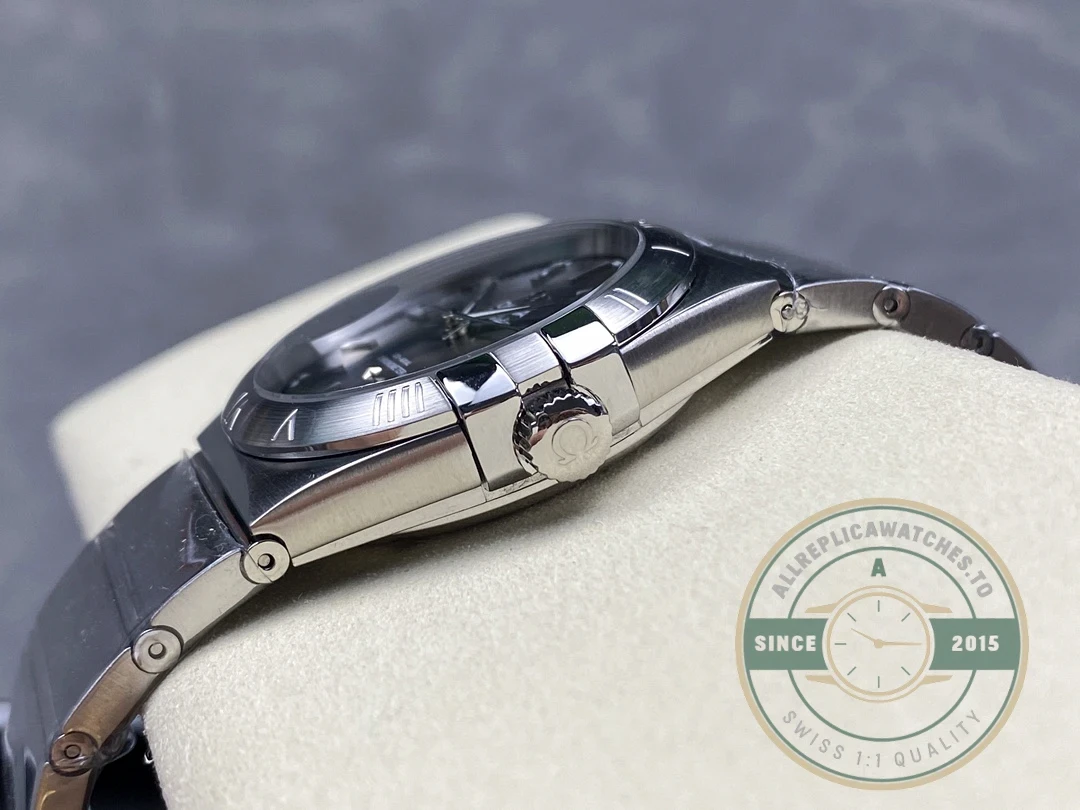 Attention to detail is evident throughout the construction. The stainless steel construction ensures durability for daily wear while maintaining its appearance over time. The crown is signed with the Omega logo, and the clasp mechanism provides secure and comfortable fit on the wrist.