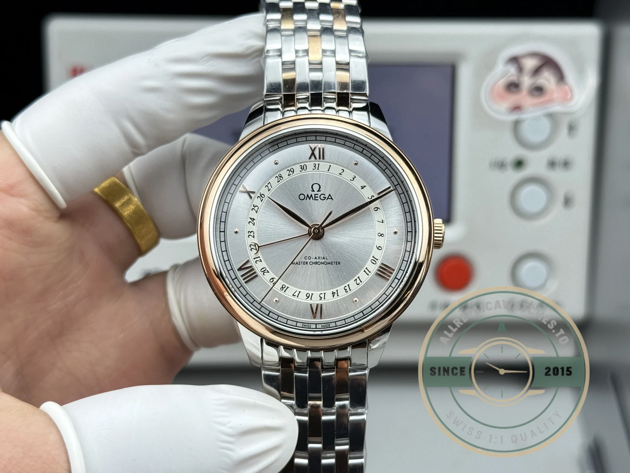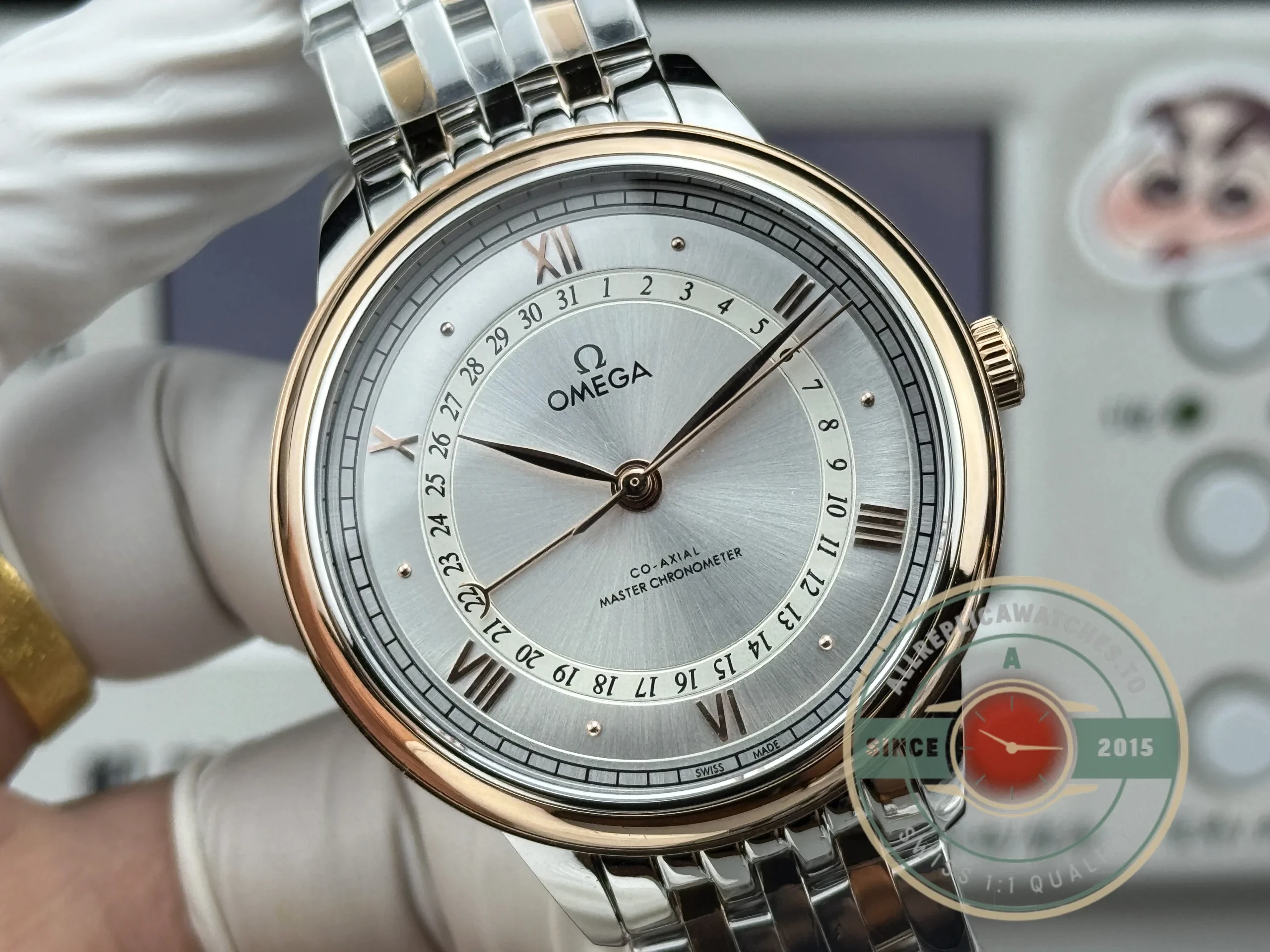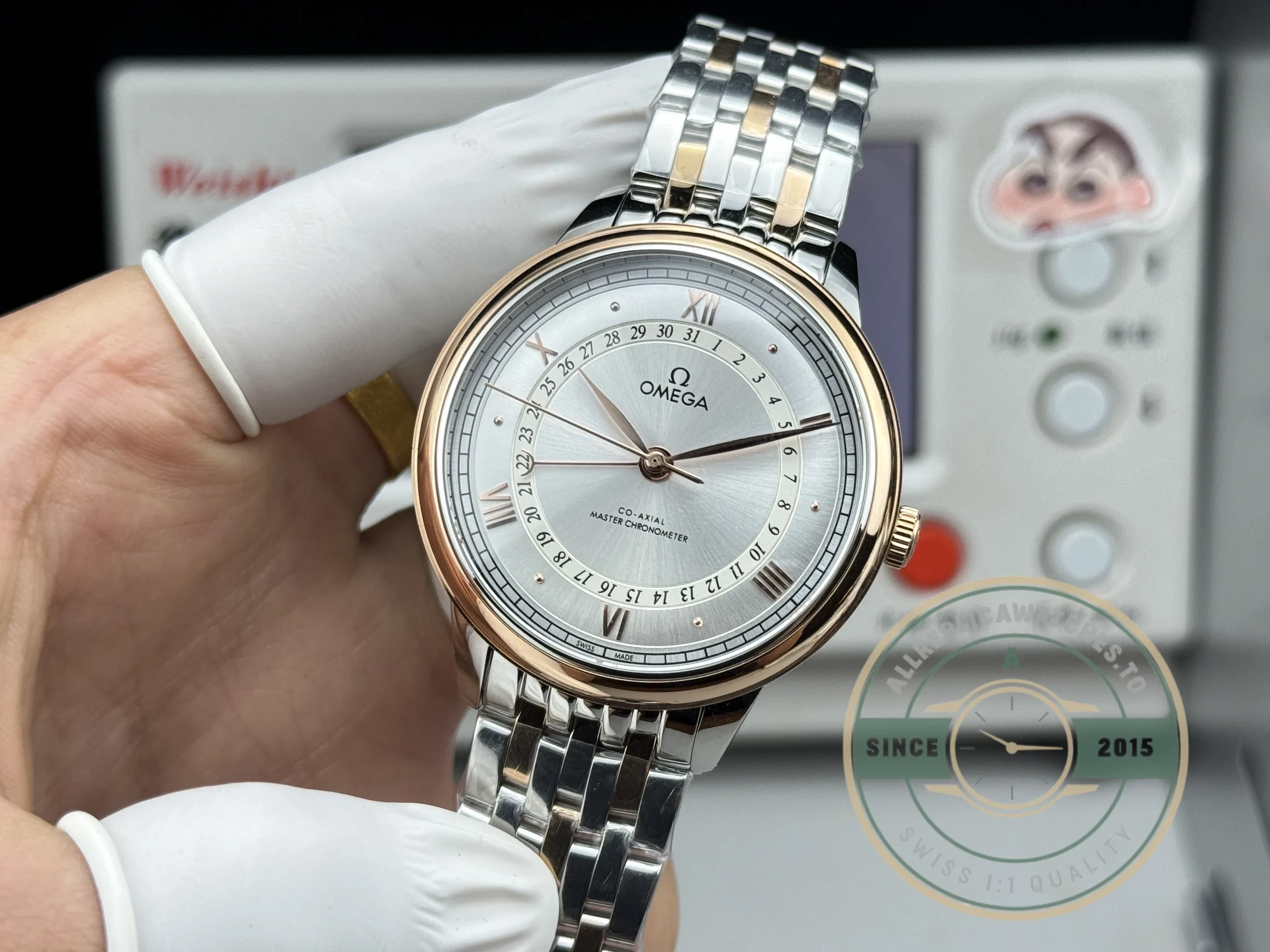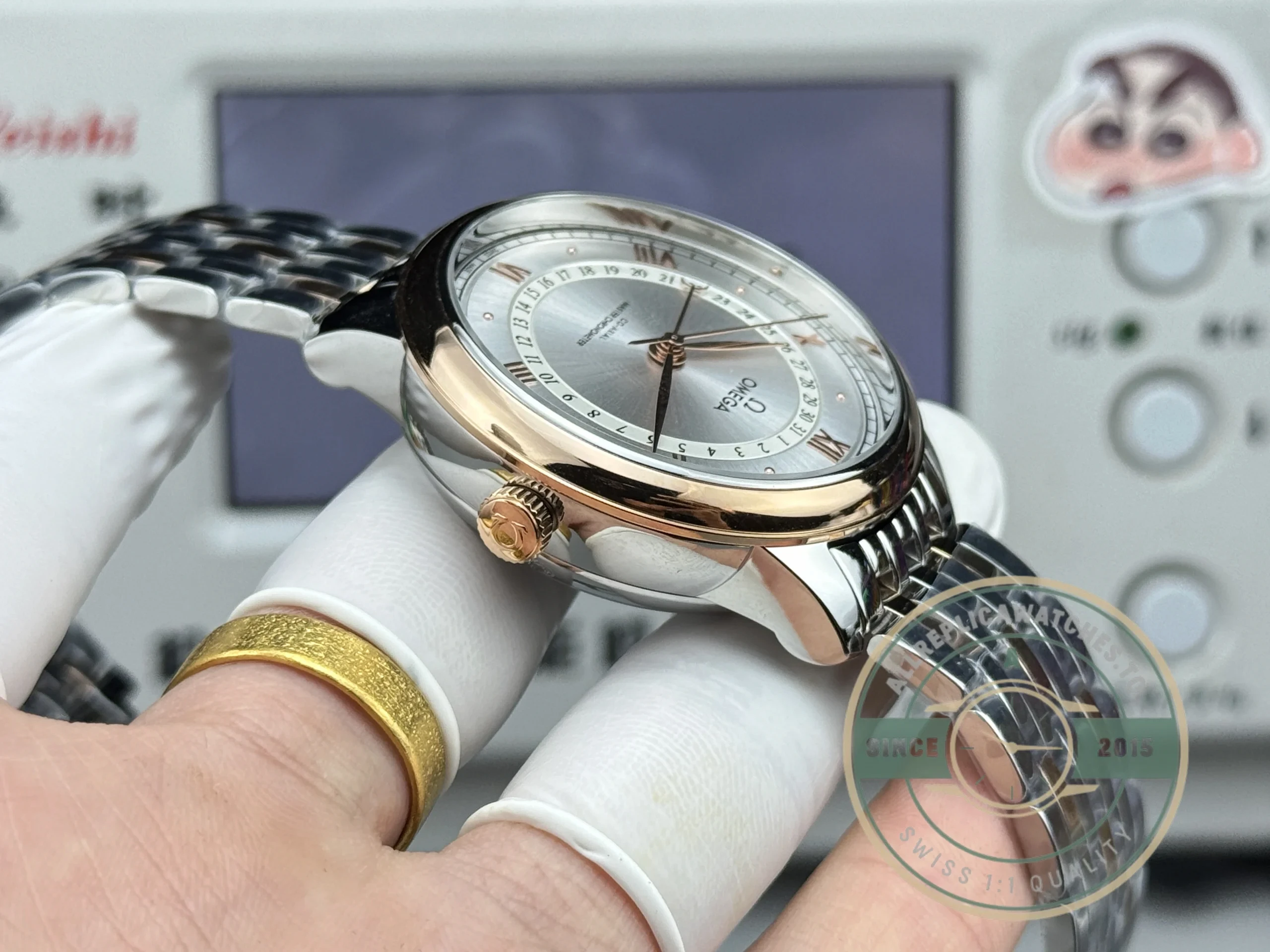 Attention to detail is evident throughout the construction. The rose gold tones complement both formal attire and casual wear. The crown is signed with the Omega logo, and the clasp mechanism provides secure and comfortable fit on the wrist.
