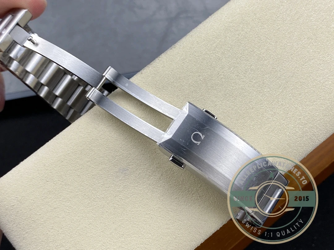 Attention to detail is evident throughout the construction. The stainless steel construction ensures durability for daily wear while maintaining its appearance over time. The crown is signed with the Omega logo, and the clasp mechanism provides secure and comfortable fit on the wrist.
