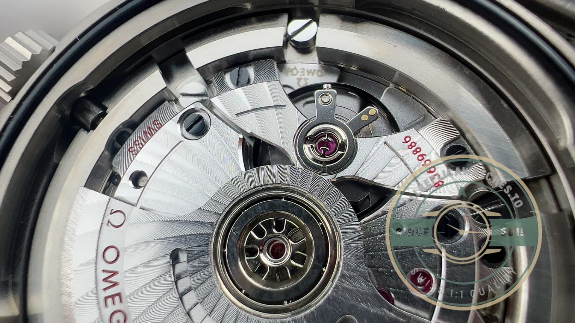 Powered by a Co-Axial chronograph caliber featuring a column-wheel mechanism for precise start-stop-reset action. The Co-Axial escapement reduces friction between components, resulting in improved long-term timing accuracy and longer service intervals compared to traditional lever escapements. A sapphire display caseback reveals the movement finishing, including decorated rotor and bridges.