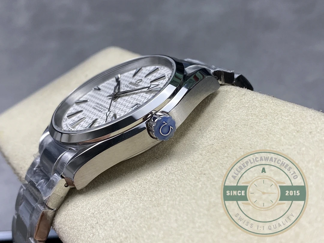 Attention to detail is evident throughout the construction. The stainless steel construction ensures durability for daily wear while maintaining its appearance over time. The crown is signed with the Omega logo, and the clasp mechanism provides secure and comfortable fit on the wrist.