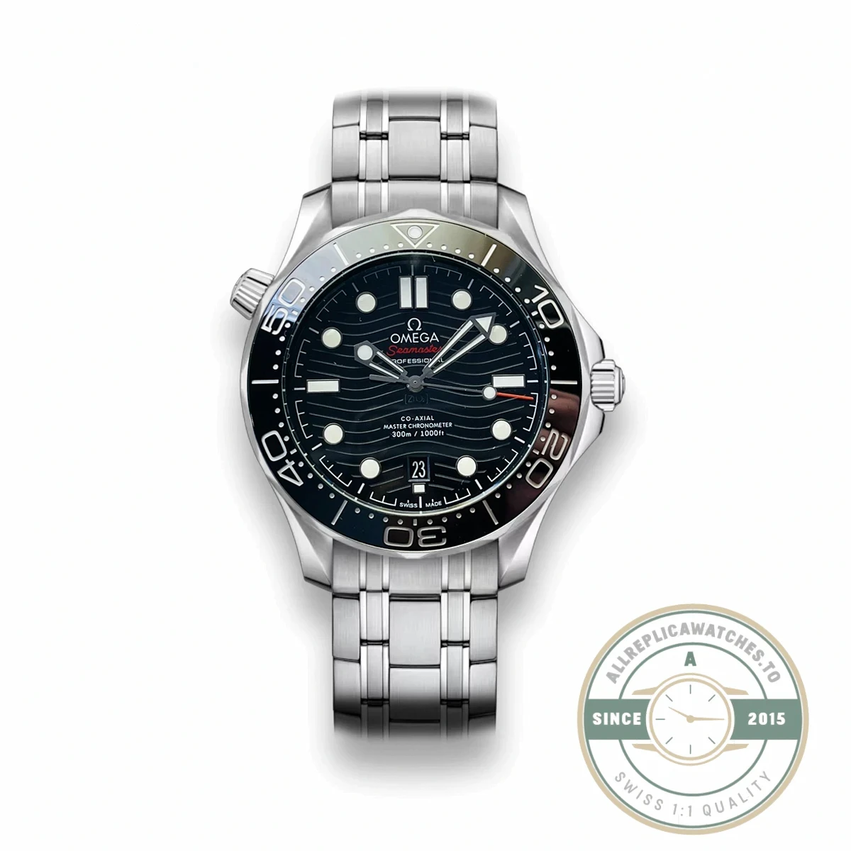 The Omega Seamaster ref. 210.30.42.20.01.001 features a 42mm stainless steel case with a black dial. This model is part of our Seamaster collection. 42mm stainless steel case with black dial. Co-Axial Master Chronometer, sapphire crystal, date display. Steel bracelet with folding clasp.