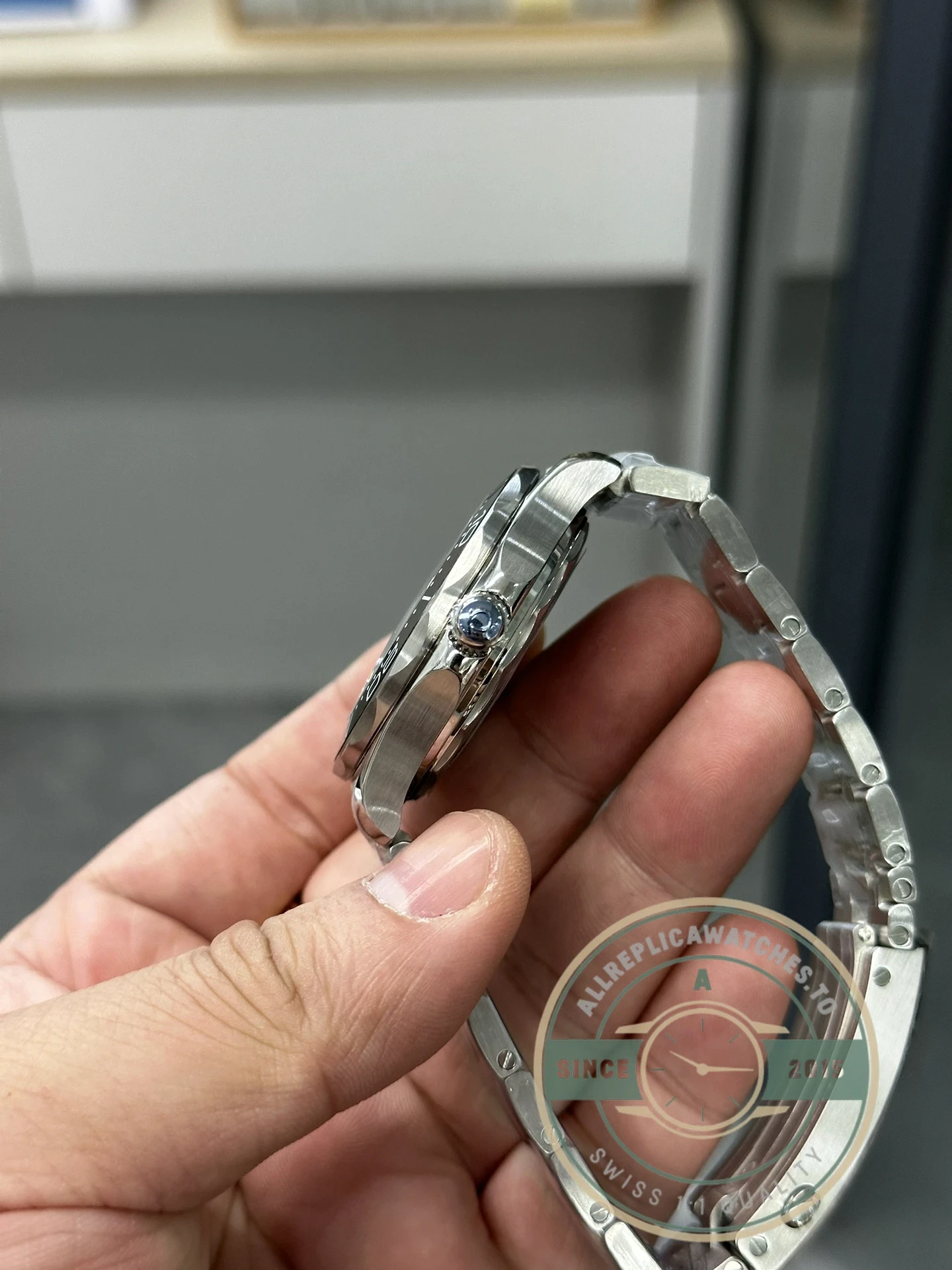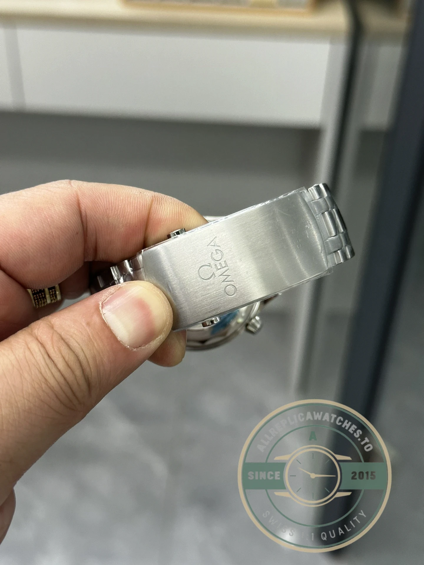 Attention to detail is evident throughout the construction. The stainless steel construction ensures durability for daily wear while maintaining its appearance over time. The crown is signed with the Omega logo, and the clasp mechanism provides secure and comfortable fit on the wrist.