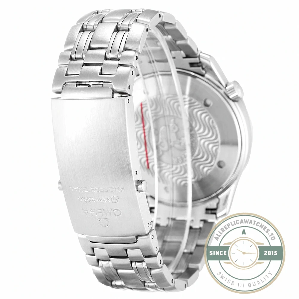 Attention to detail is evident throughout the construction. The stainless steel construction ensures durability for daily wear while maintaining its appearance over time. The crown is signed with the Omega logo, and the clasp mechanism provides secure and comfortable fit on the wrist.