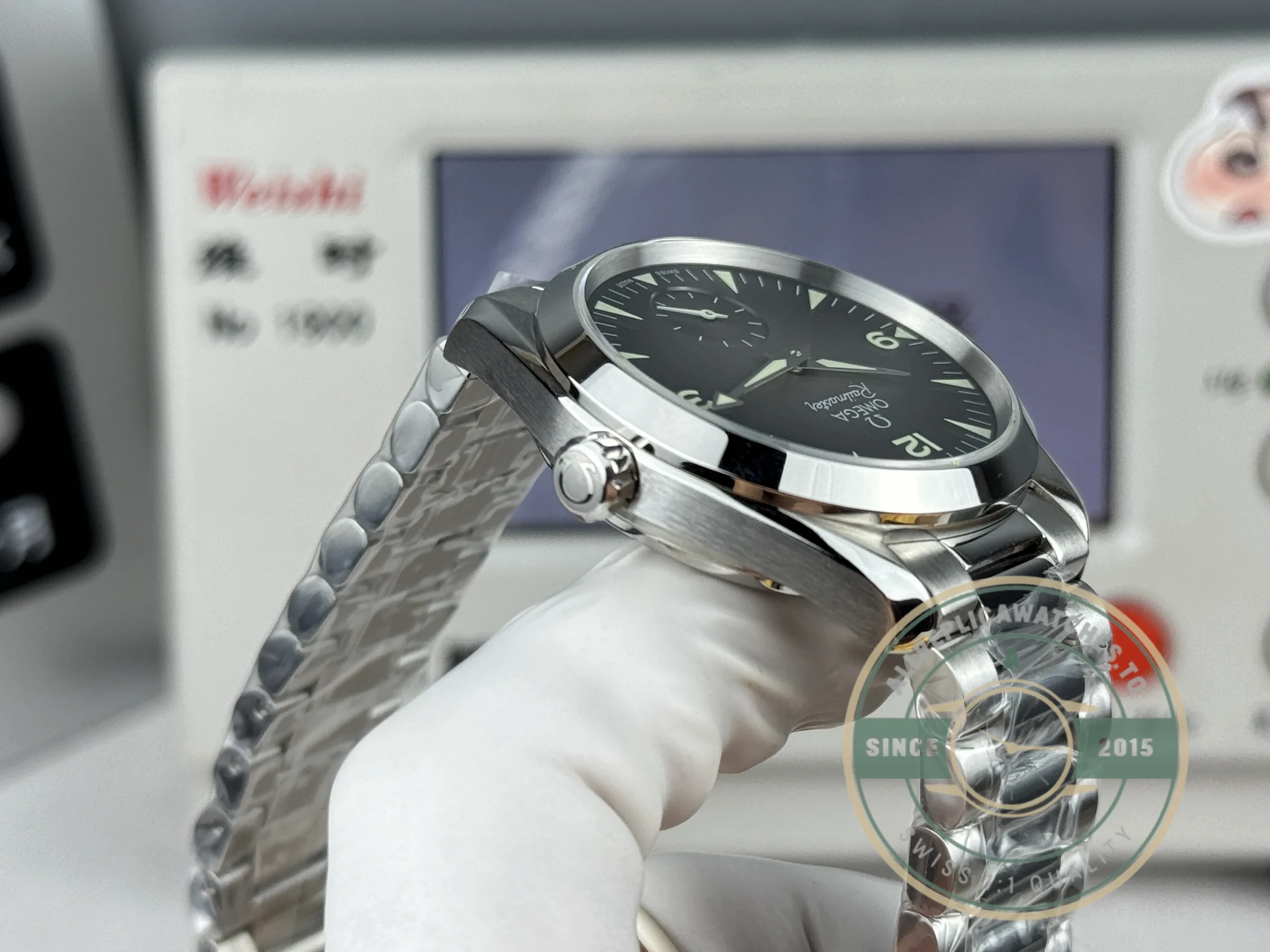 Complete set: watch, branded presentation box, warranty card, and instruction manual. Browse more in our full Omega collection.