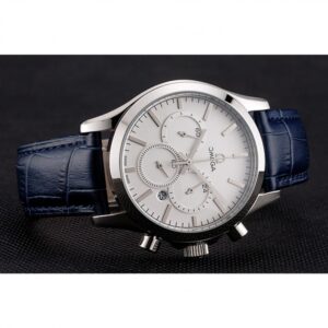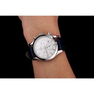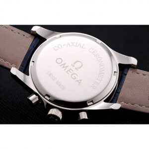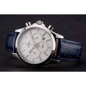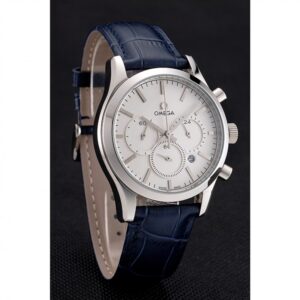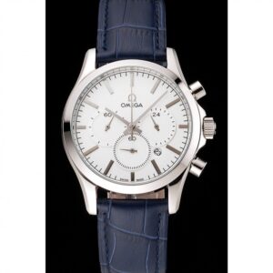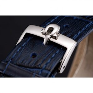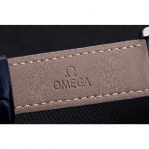 Omega and logo heat embossed blue crocodile leather strap with Omega logo carved polished stainless steel hook-buckle clasp |