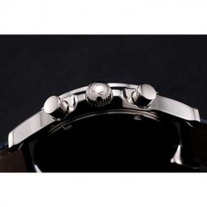 Omega logo carved polished stainless steel cutwork crown with a round push-button crown on either side of it |