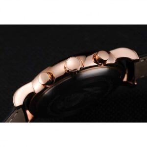 18k rose-gold plated cutwork crown with a round push-button crown on either side of it |