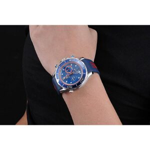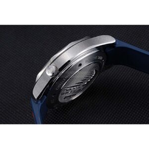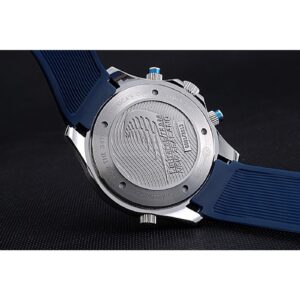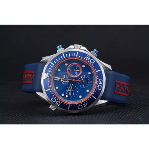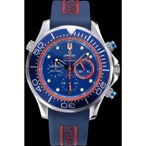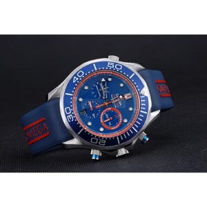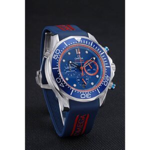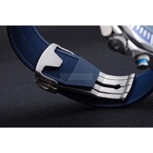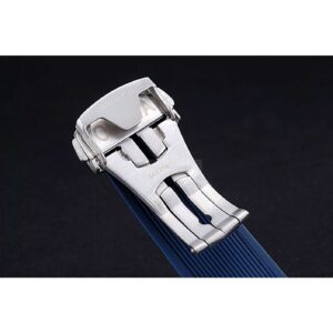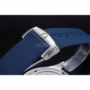 Omega heat embossed blue rubber strap with Omega logo engraved fold-in brushed stainless steel push-release hook clasp
