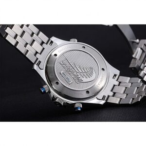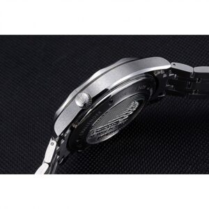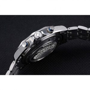 Omega logo engraved polished stainless steel cutwork crown with black enamel strip round push button crown on either side of it plus a logo engraved polished stainless steel cutwork crown on opposite top corner |