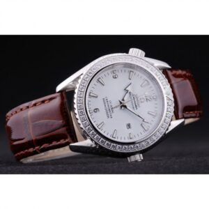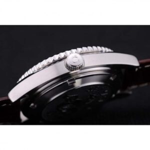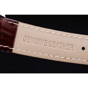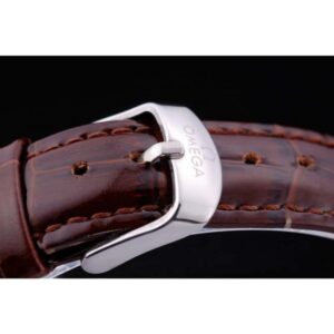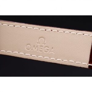 Omega heat embossed brown patent crocodile leather strap with Omega inscribed polished stainless steel hook-buckle clasp |