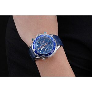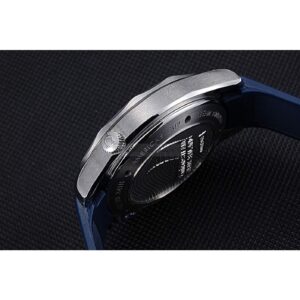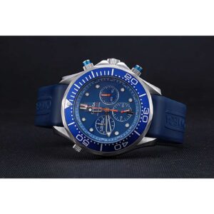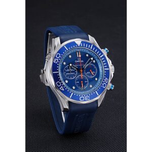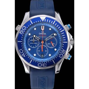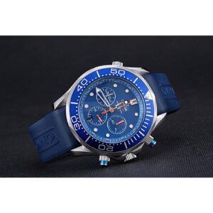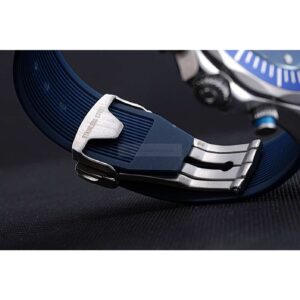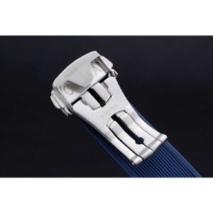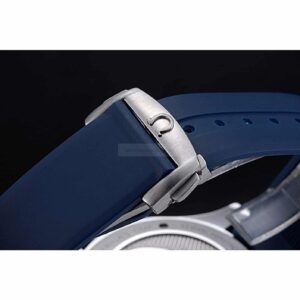 Omega heat embossed blue rubber strap with Omega logo engraved fold-in brushed stainless steel push-release hook clasp |