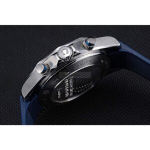 Omega logo engraved polished stainless steel cutwork crown with blue enamel strip round push button crown on either side of it plus a logo engraved polished stainless steel cutwork crown on opposite top corner |