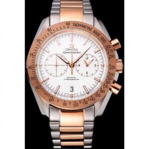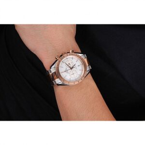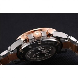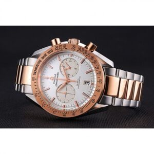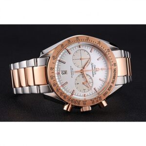 Omega logo engraved 18k rose-gold plated cutwork crown with an 18k rose-gold plated round push button crown on either side of it |