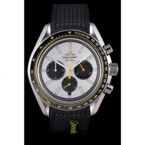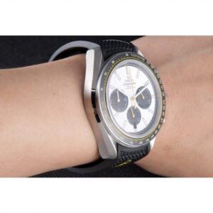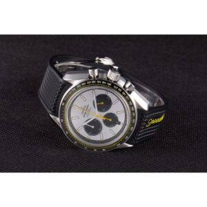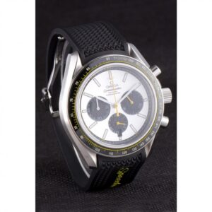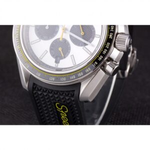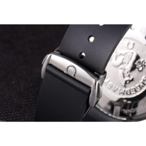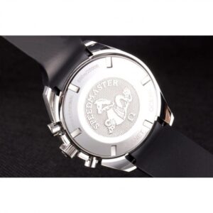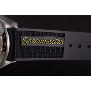 Speedmaster black rubber strap with Omega logo polished stainless steel push-release hook-buckle clasp |